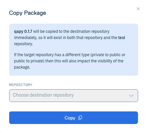 After clicking a "copy" button you will be presented with the Copy Package form. Select the destination repository from the drop-down menu and click "Copy" to complete the package copy: