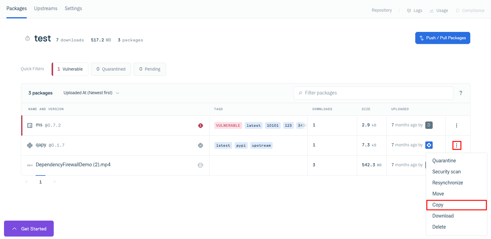To copy a package via the Repository packages list, click the traffic sign button next to the right of the package then click "Copy" in the dropdown menu