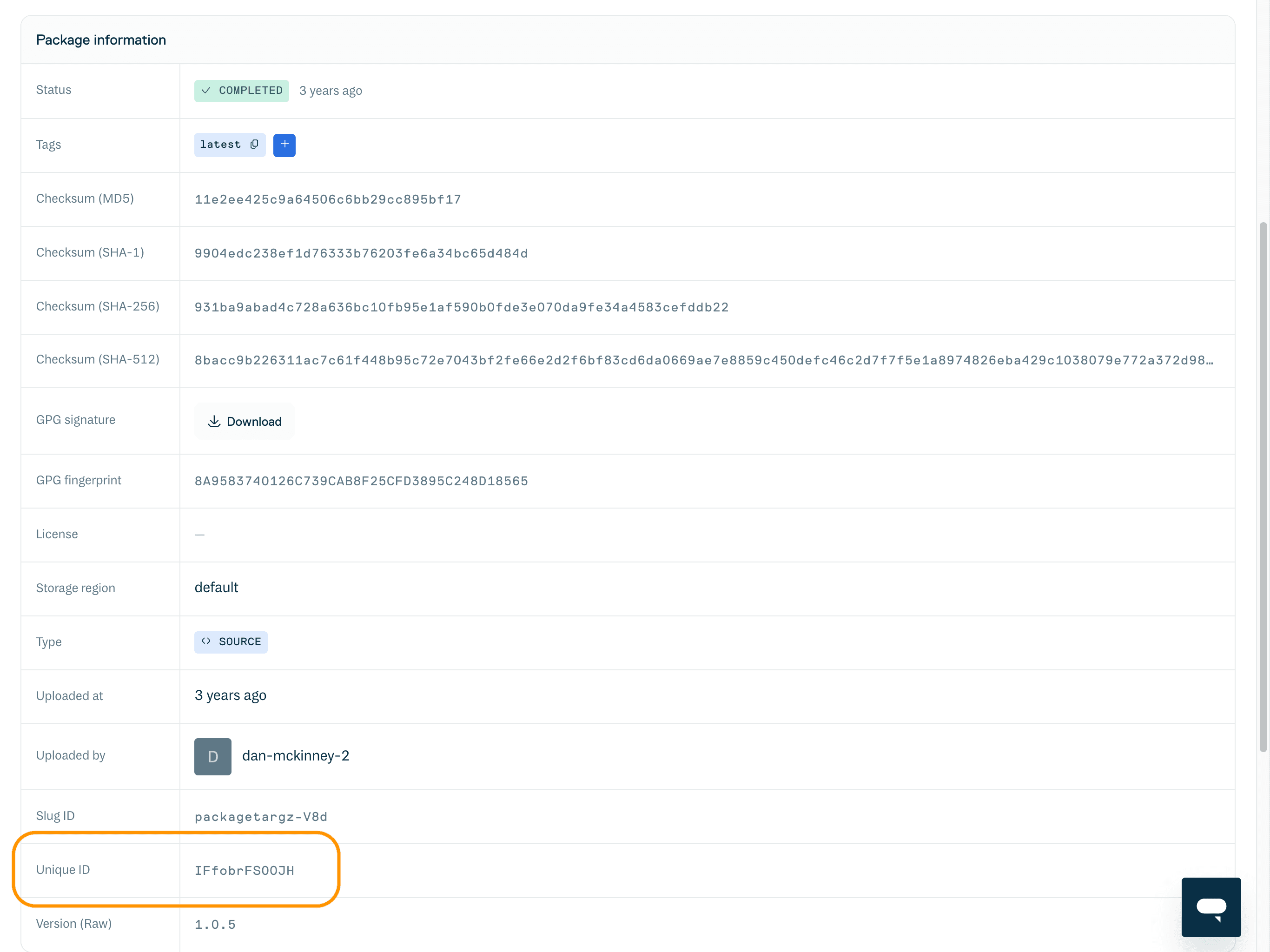 The Unique ID for a package is also displayed as part of the output when pushing a package to a repository using the cloudsmith push command: