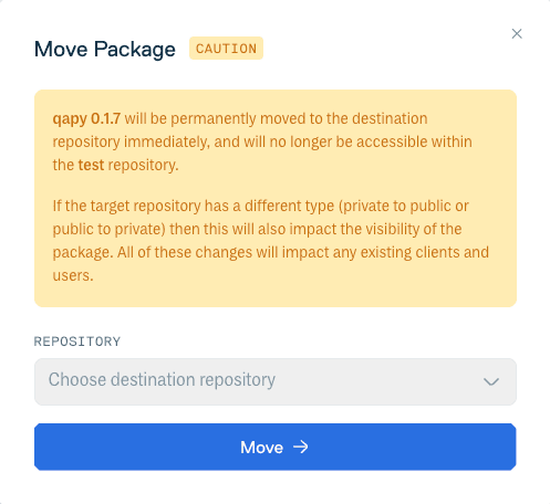 After clicking a move button you will be presented with the Move Package form. Select the destination repository from the drop-down menu and click "Move" to complete the package move: