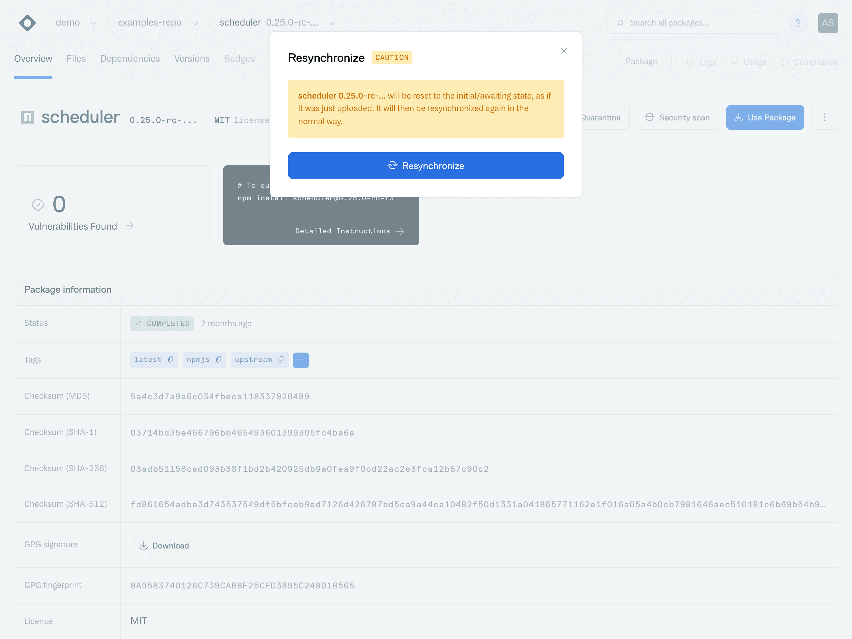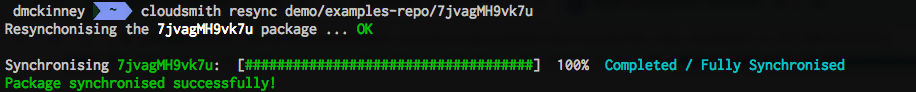 cloudsmith resync demo/examples-repo/7jvagMH9vk7uIn this example, we identified that the package we want to resync has the Unique ID "7jvagMH9vk7u" and is in the "examples-repo" repository: