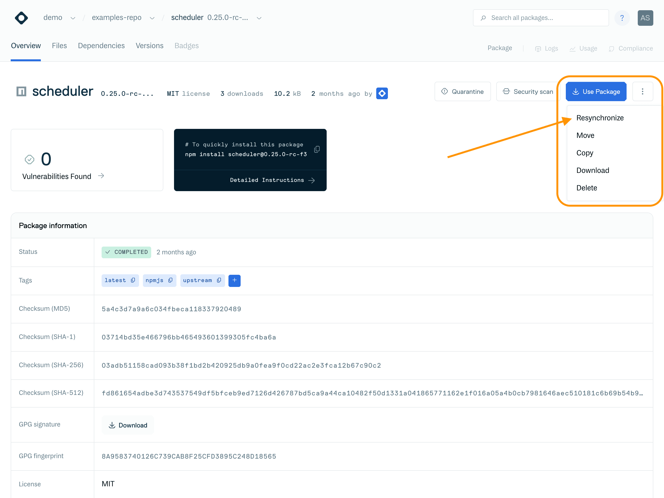 To resync a package via the package detail page, click the Action menu to the right of the "Use Package" button and select "Resynchronize":