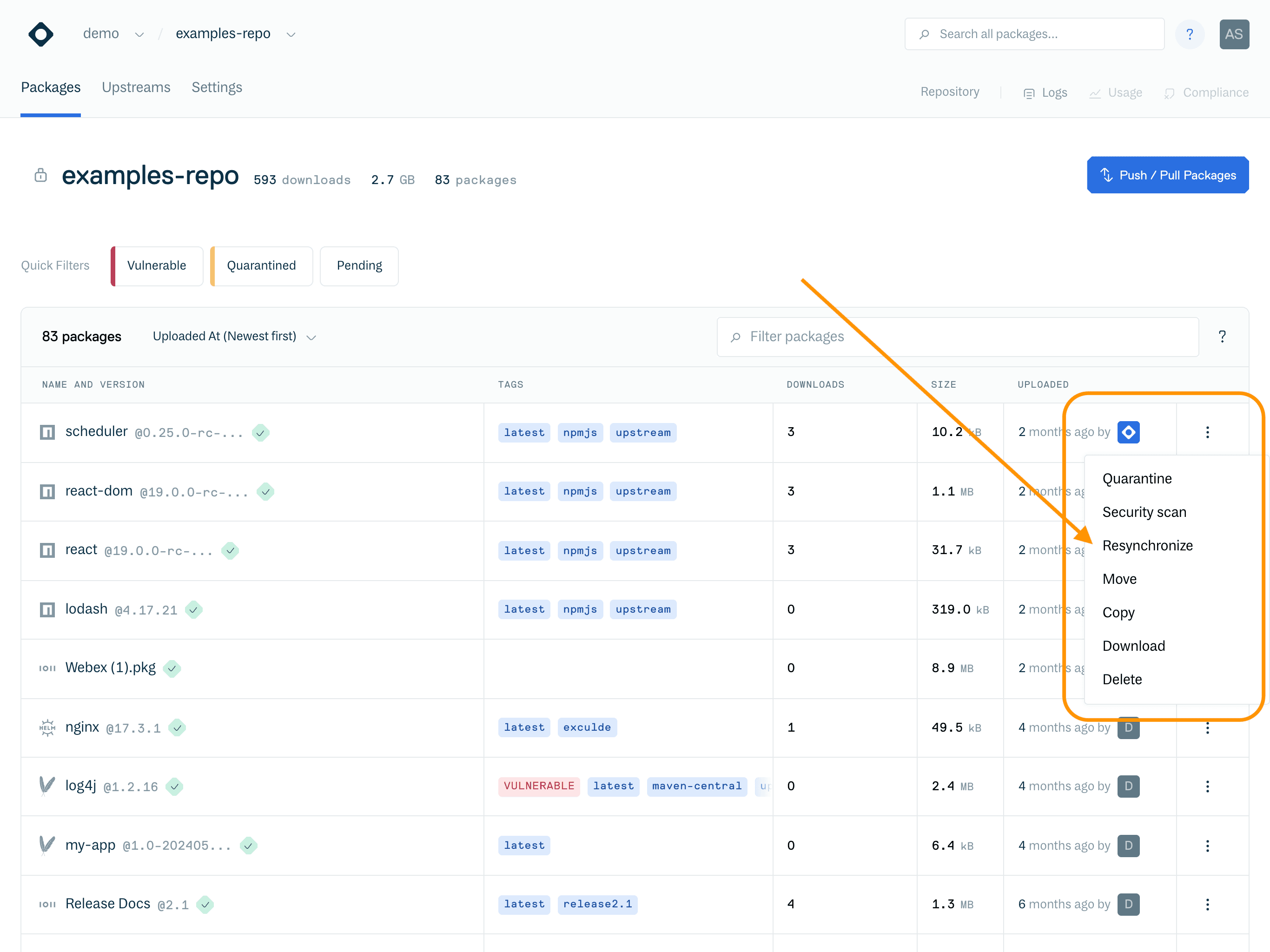 To resync a package via the repository packages list, click the Action menu to the right of the package name, then select "Resynchronize":