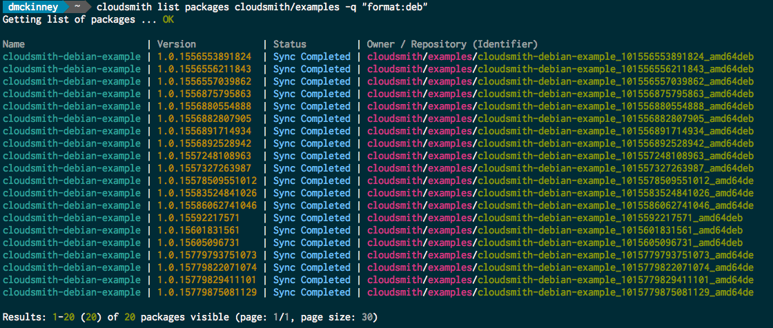 cloudsmith list packages cloudsmith/examples -q "format:deb"