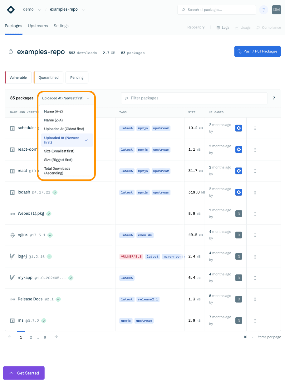 Sorting Packages via the Cloudsmith web app