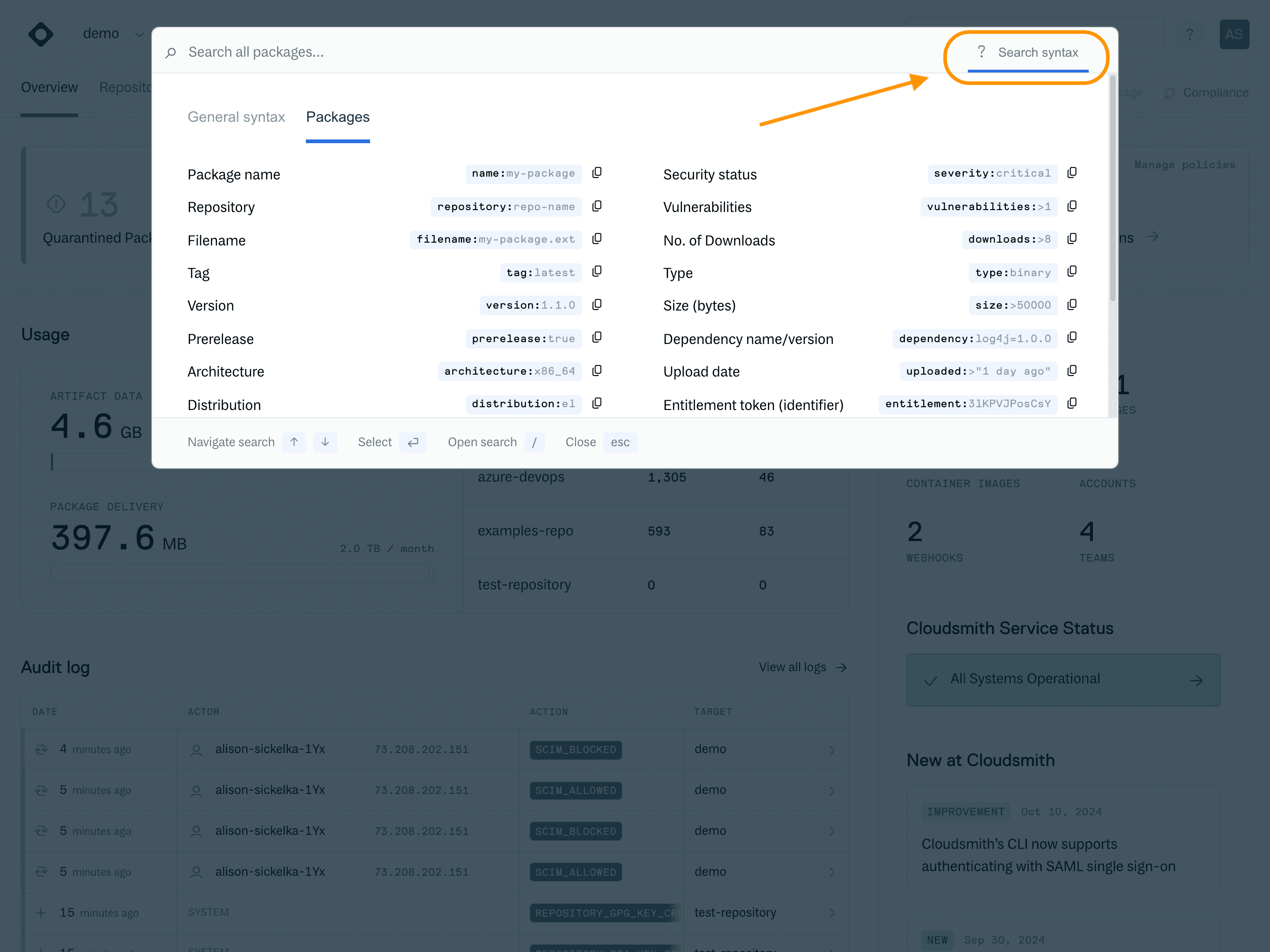 Cloudsmith provides a powerful and flexible query language that enables you to instantly find any package, in any repository, based on a comprehensive set of attributes. This syntax can be used in multiple areas of the product.