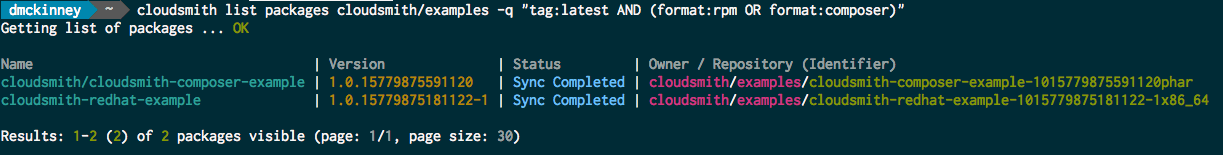 cloudsmith list packages cloudsmith/examples -q "tag:latest AND (format:rpm OR format:composer)"