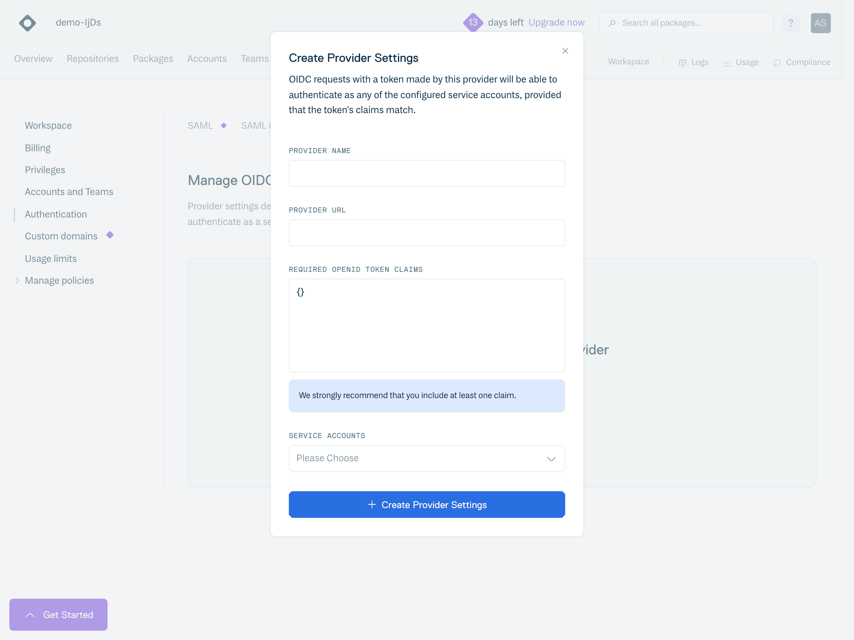 OIDC Provider Settings can only be configured if there's at least one Service Account in your organization