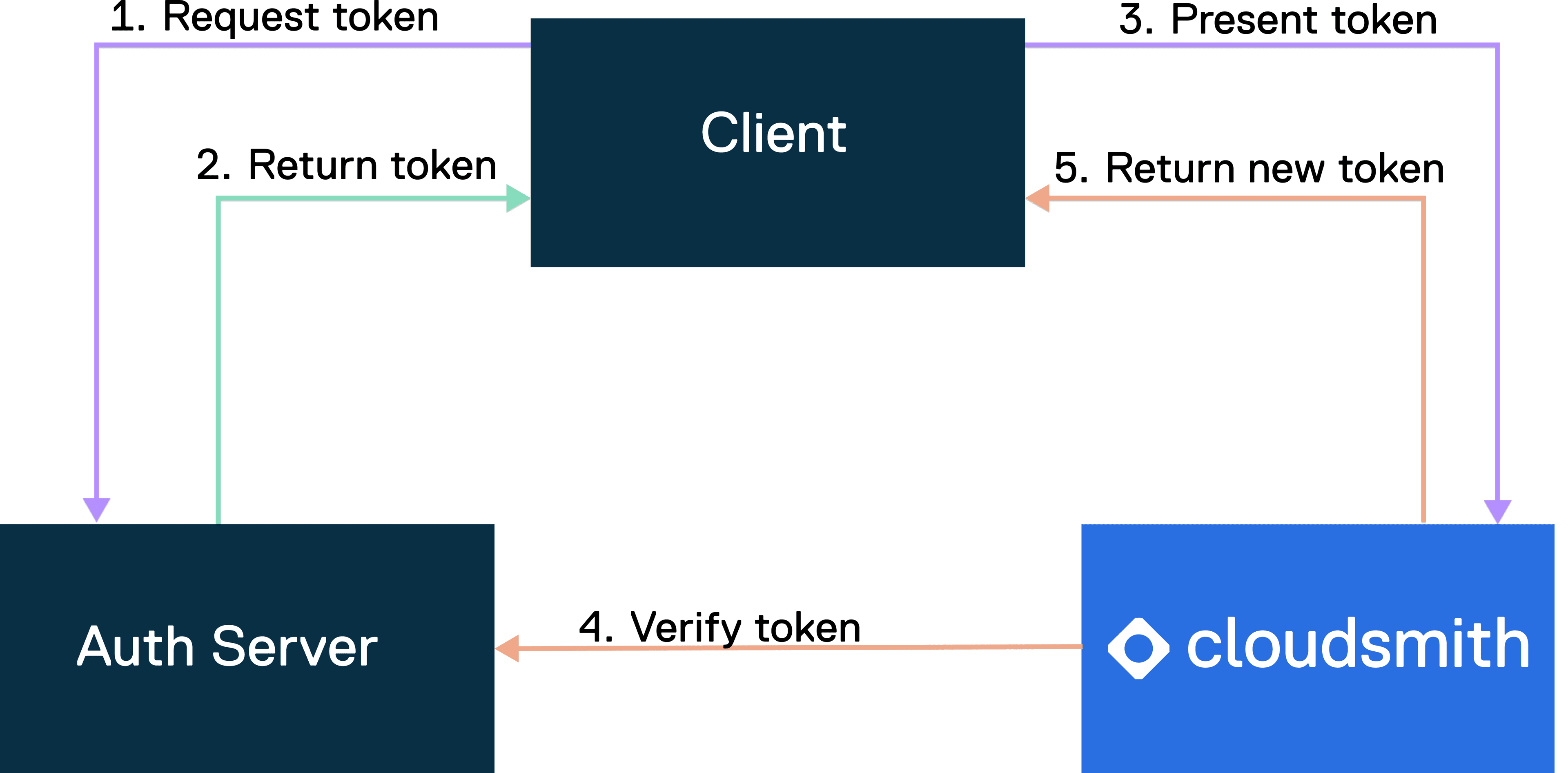 - Present token: The client presents a JWT token to Cloudsmith for access to resources.