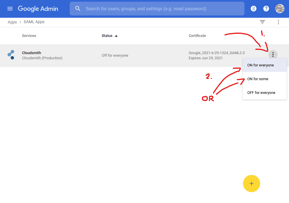 Finally, you'll need to enable the Cloudsmith SAML application for all or some member's of your Google (G-Suite) organization. Go back to the SAML apps dashboard (as in step 2). Then, click the three dots to the right of the Cloudsmith application, and select either ON for everyone (to enable for all users), or ON for some (to enable for a subset of users):