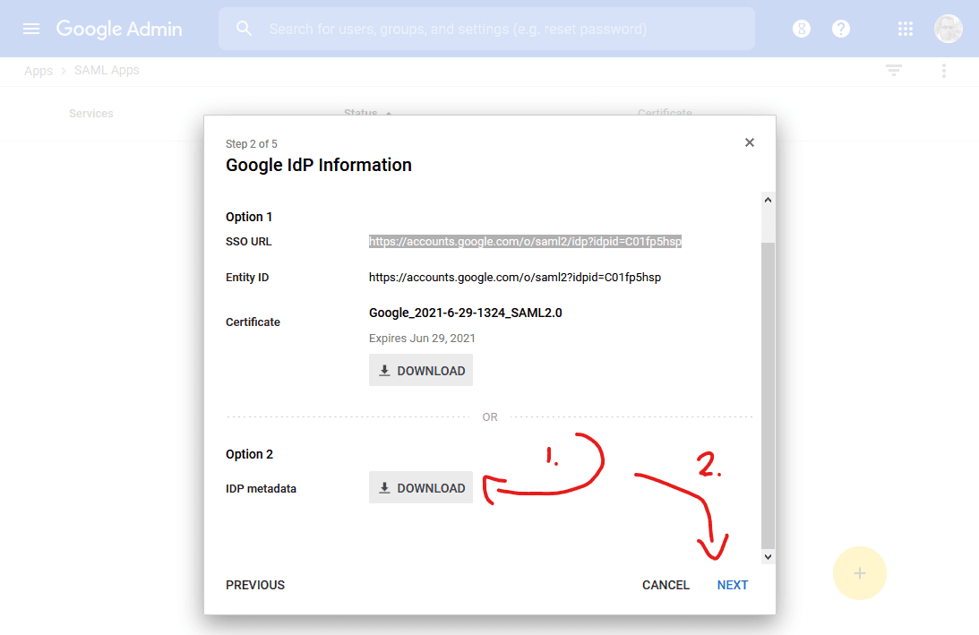 In Step 2, Google IdP Information, click on the DOWNLOAD button beside IDP metadata and save this file, then click NEXT: