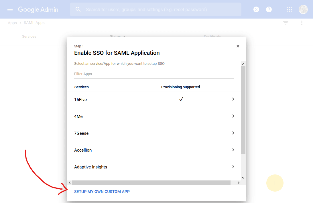 A new modal dialog pops up. In Step 1, Enable SSO for SAML Application, click on SETUP MY OWN CUSTOM APP at the bottom: