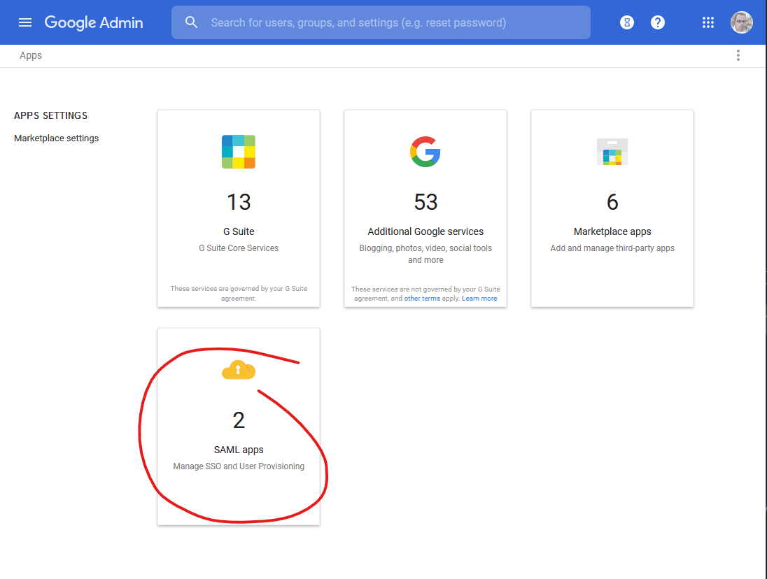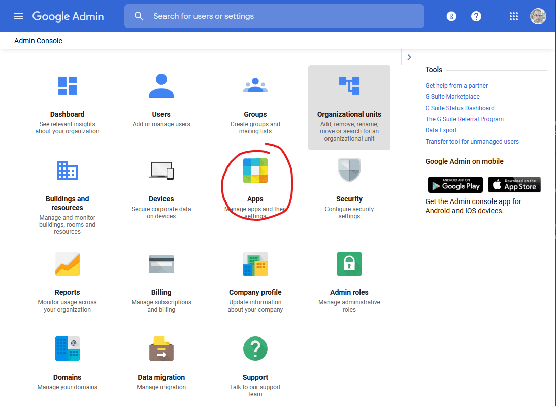 Log into the Google (G-Suite) Admin Console and click Apps: