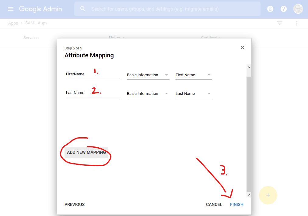 Next, we'll configure Google (G-Suite) to also send name details to Cloudsmith. Create two mappings. The first is "FirstName" as the value, mapped from Basic Information / First Name. The second is "LastName" as the value, mapped from Basic Information / Last Name. Then click on FINISH: