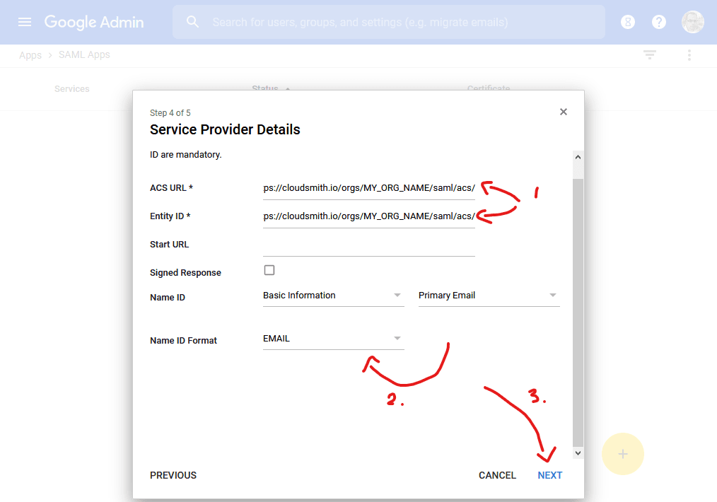 In Step 4, Service Provider Details, enter: https://cloudsmith.io/MY_ORG_NAME/saml/acs/ as the ACS URL and Entity ID, where "MY_ORG_NAME" is replaced with your organization's slug (i.e. what your normally see in the URL bar for your organization).