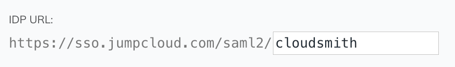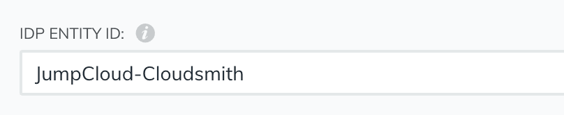 Next, you'll need to choose an IdP entity ID, which is just a unique string used to identify this application/connector with JumpCloud. It doesn't matter what you use, so long as it's unique within your JumpCloud account. For example purposes we use "JumpCloud-Cloudsmith":