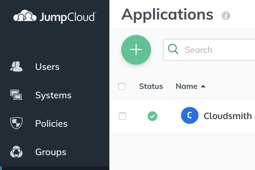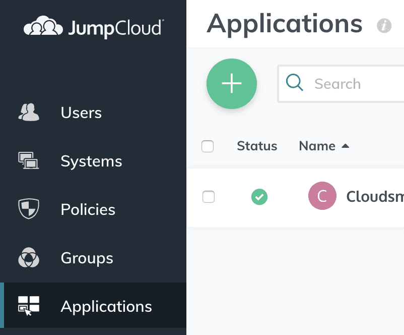 Log in as an administrator to JumpCloud, choose Applications from the sidebar and use the green + icon to add a new application: