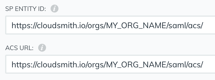 Next, we'll fill in SP Entity ID and ACS URL with the same value. To determine the value we use the following format: https://cloudsmith.io/MY_ORG_NAME/saml/acs/ where "MY_ORG_NAME" is replaced with your organization's slug e.g. for the cloudsmith org we use https://cloudsmith.io/cloudsmith/saml/acs/ (you can find your organization's slug in the URL bar when you are logged into Cloudsmith, or browsing to User Settings > Workspaces):