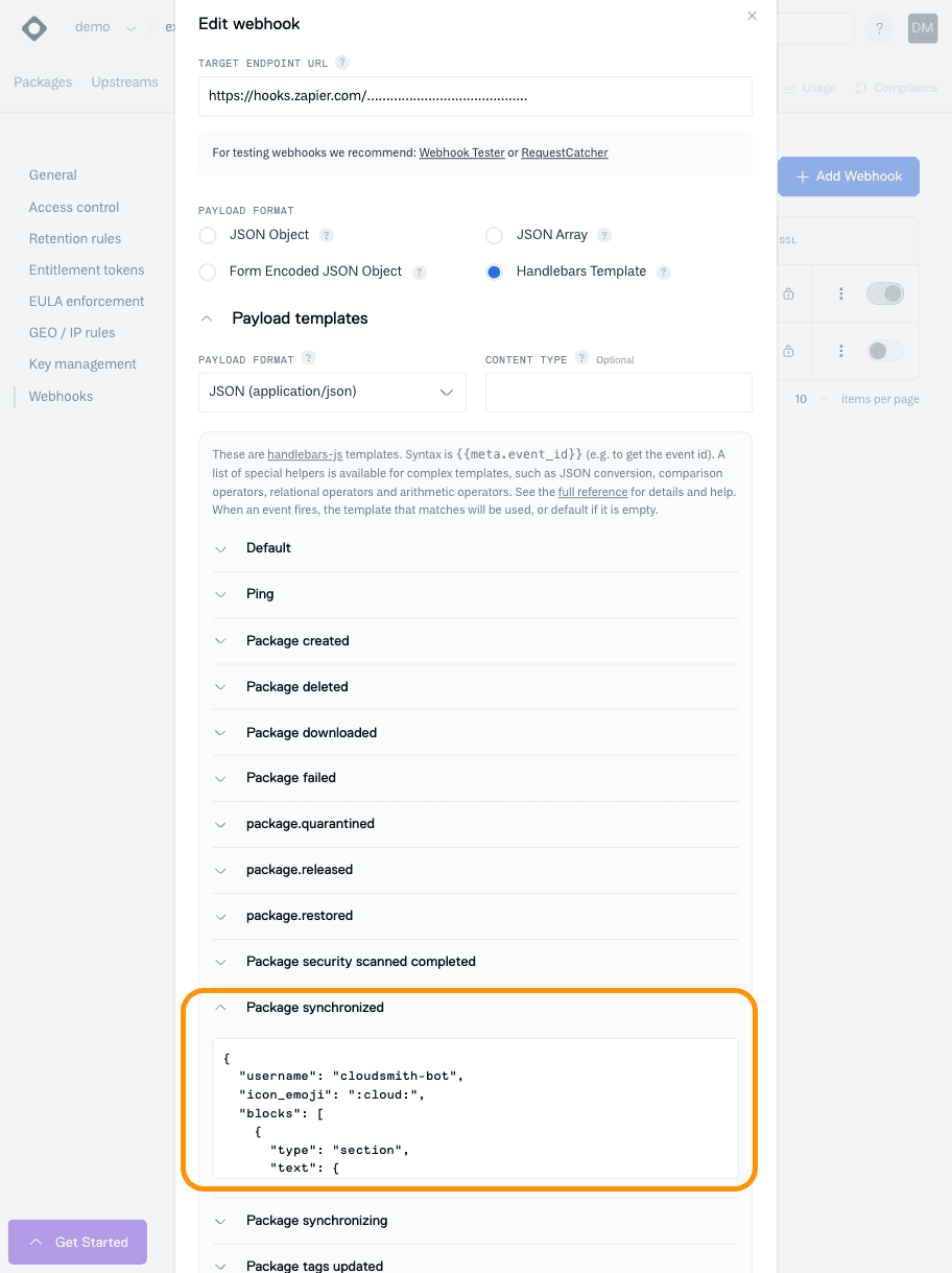 Cloudsmith supports multiple payload formats for webhooks. Plus a templating format, using the handlebars language, for the ultimate in flexibility. You can find more details on that, later in this guide.