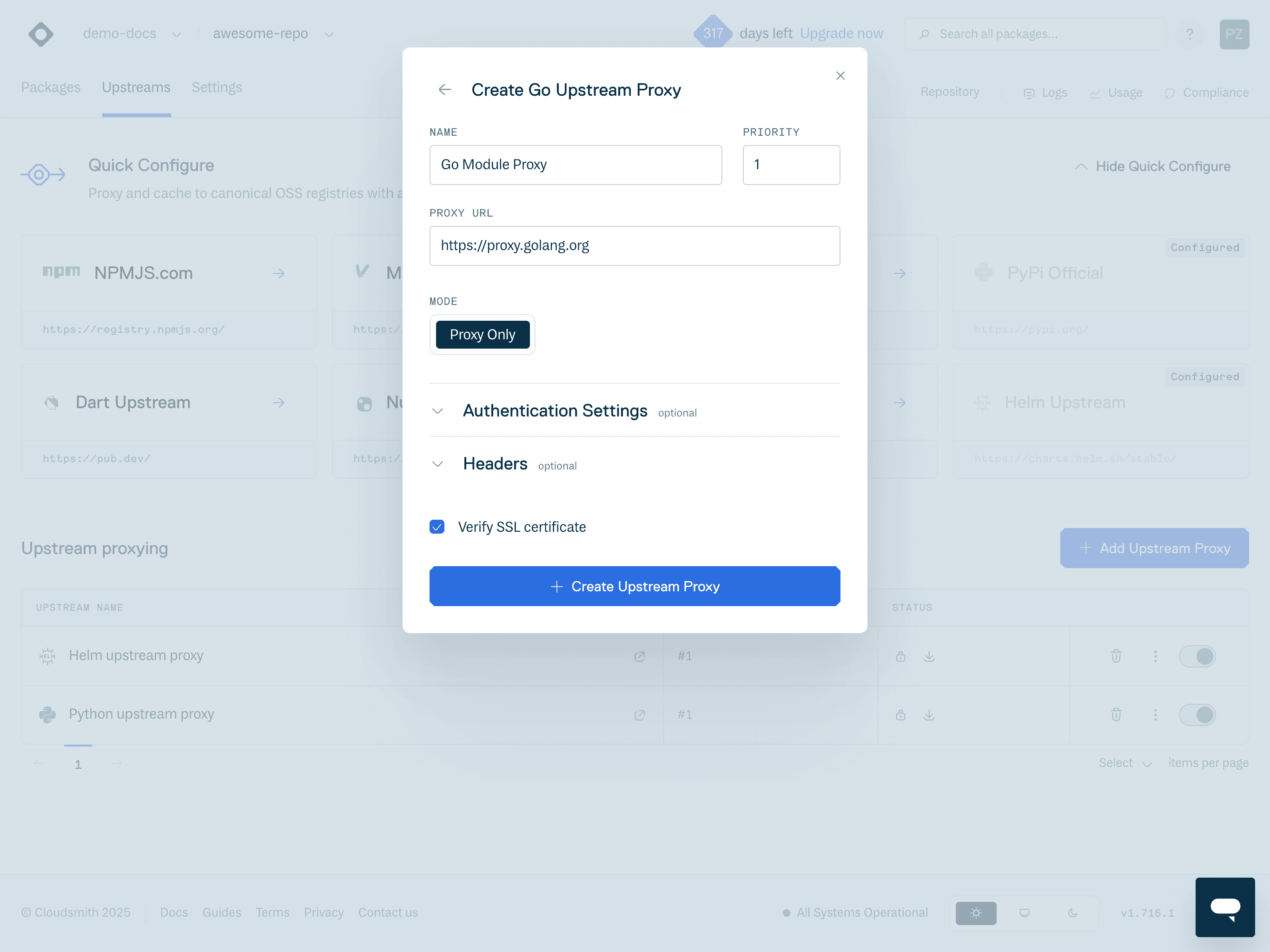 In the Upstream creation menu, define a name your Upstream and in the Proxy URL field insert https://proxy.golang.org. Click on + Create Upstream Proxy and the upstream shoud become immediately available.