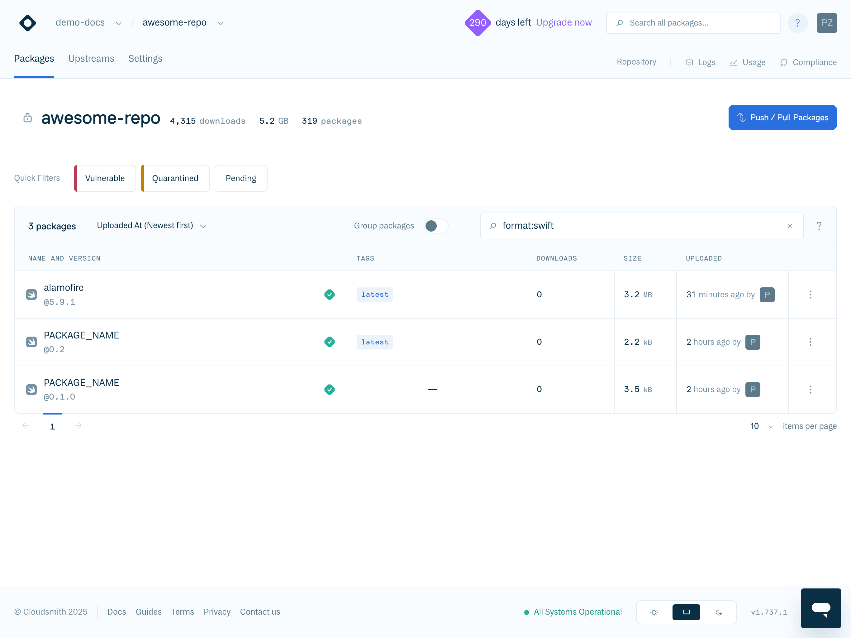 swift package-registry publish alamofire.alamofire 5.9.1 --metadata-path ./package-metadata.jsonDone. You've successfully published your Swift package to a Cloudsmith registry. You can now view the package in your Cloudsmith web app.