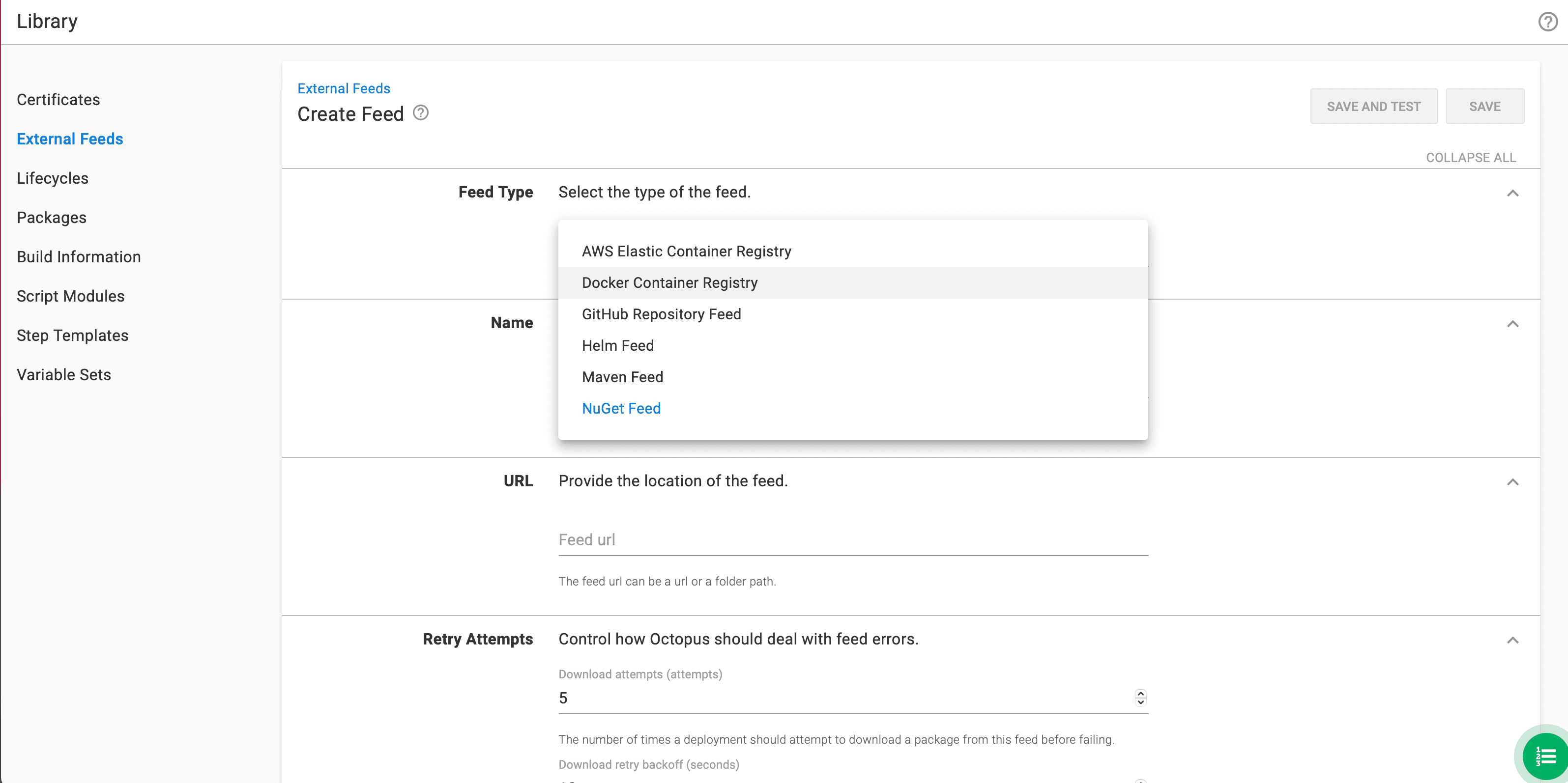 Then, create a new Octopus Feed by navigating to External Feeds->Add Feed.