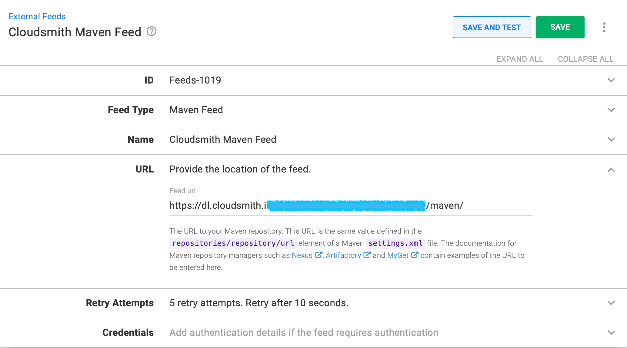 - Enter the HTTP/HTTPS URL of the feed for your Cloudsmith Maven repository following the instructions in the box below: