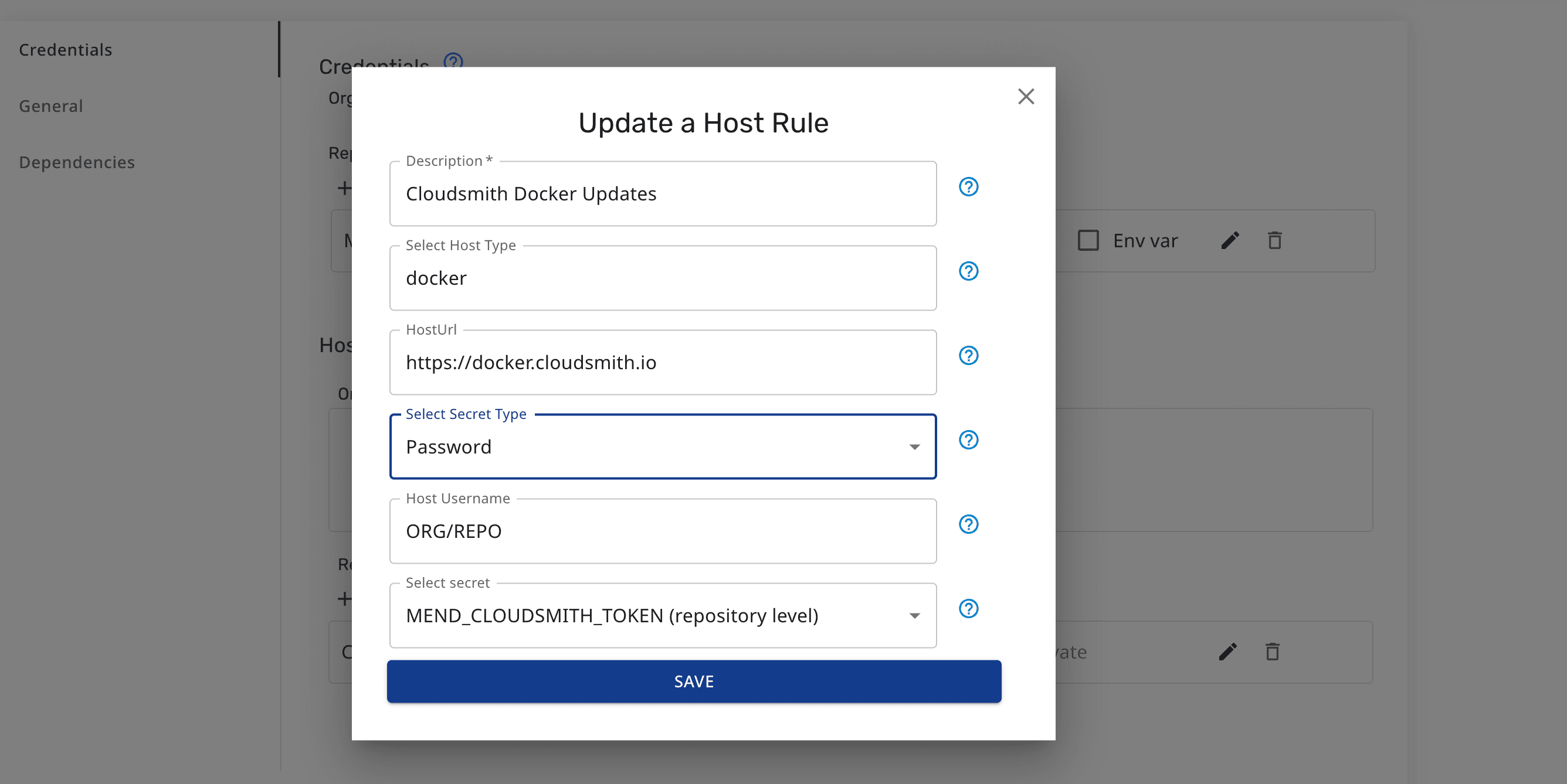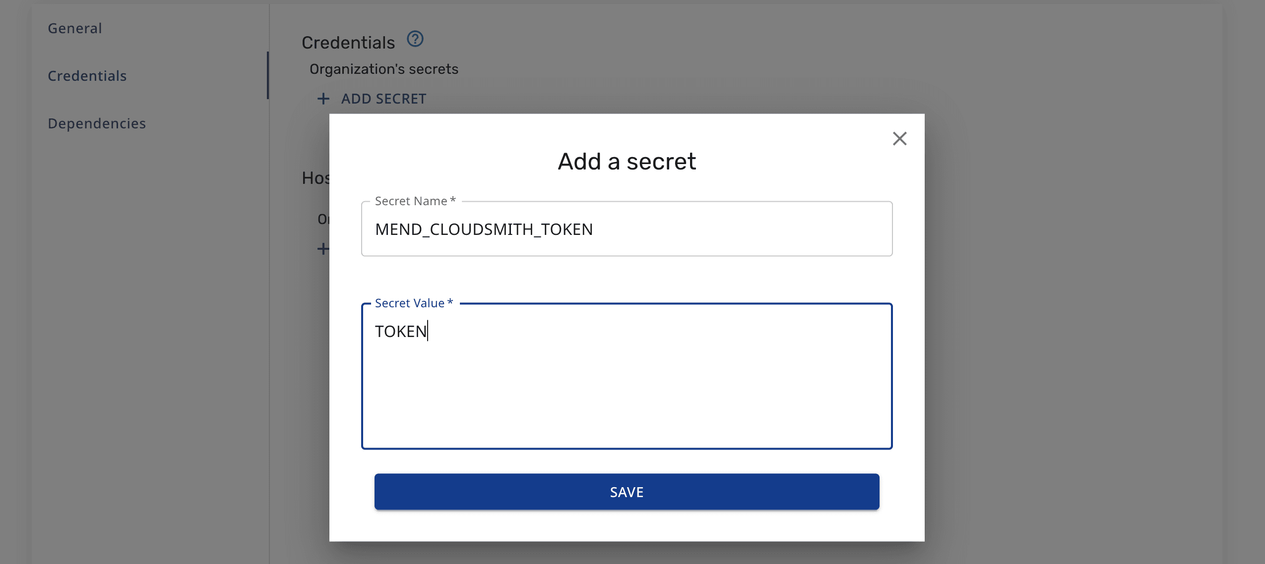 MEND_CLOUDSMITH_TOKEN. - Secret Value: Use your Cloudsmith entitlement token. Click here to learn how to generate a new one.