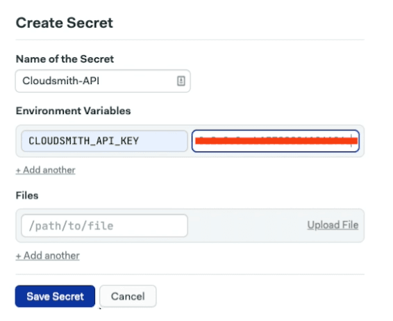 You need to add your Cloudsmith API Key in order to authenticate to Cloudsmith for pushing packages. We recommend storing your Cloudsmith API Key as a secret in Semaphore. Secrets in Semaphore are organization-level objects that can contain environment variables or files which you can then access in your build jobs.
