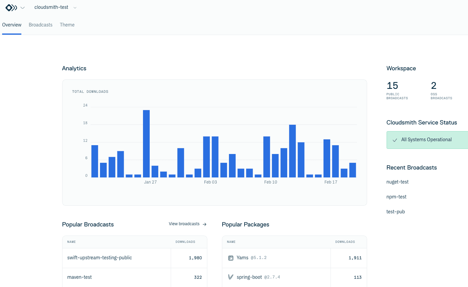 - Overview: Displays aggregated analytics for all of your broadcasting repositories, including total downloads, a list of your most popular broadcasts, and your most popular packages over the last 30 days.