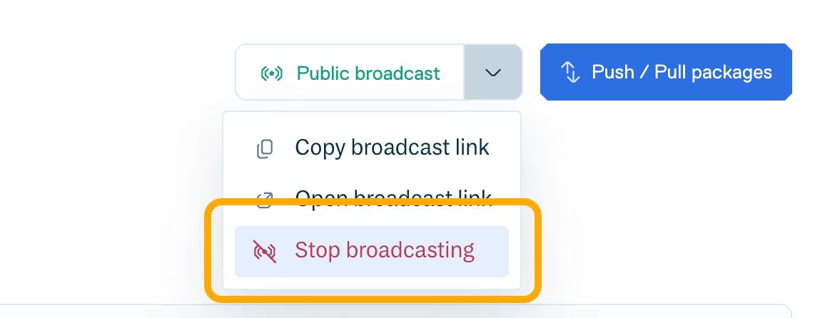 To disable a Broadcast, press status indicator, and choose "Stop broadcasting" from the drop down menu. When a Broadcast is disabled, the URL associated with it and any package within your repository will not be accessible.
