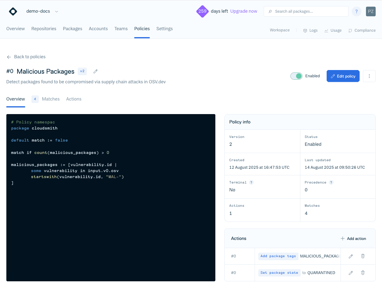 Here is an EPM policy that matches any package which has been flagged as malicious by Continuous Security, quarantines it, and adds a MALICIOUS_PACKAGE tag: