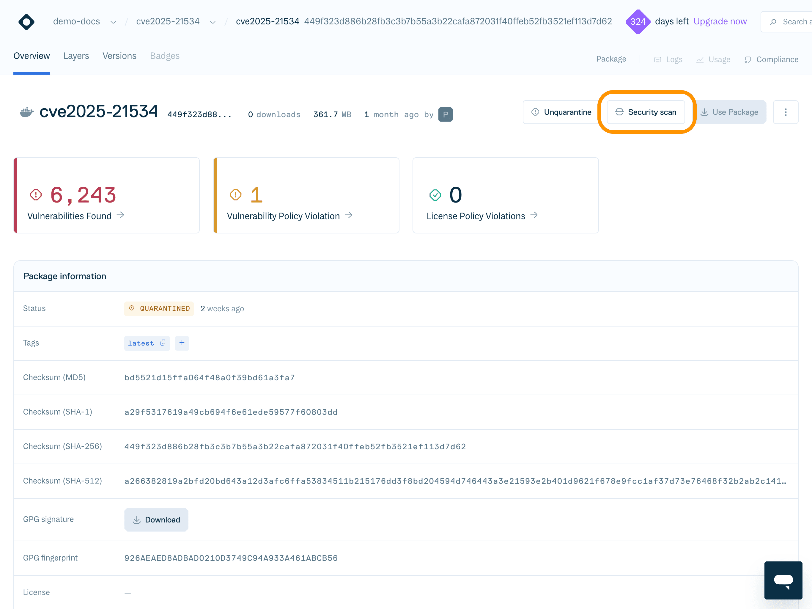 You can perform additional vulnerability scans after the scan that is performed when the package is uploaded using the Cloudsmith UI or API.
