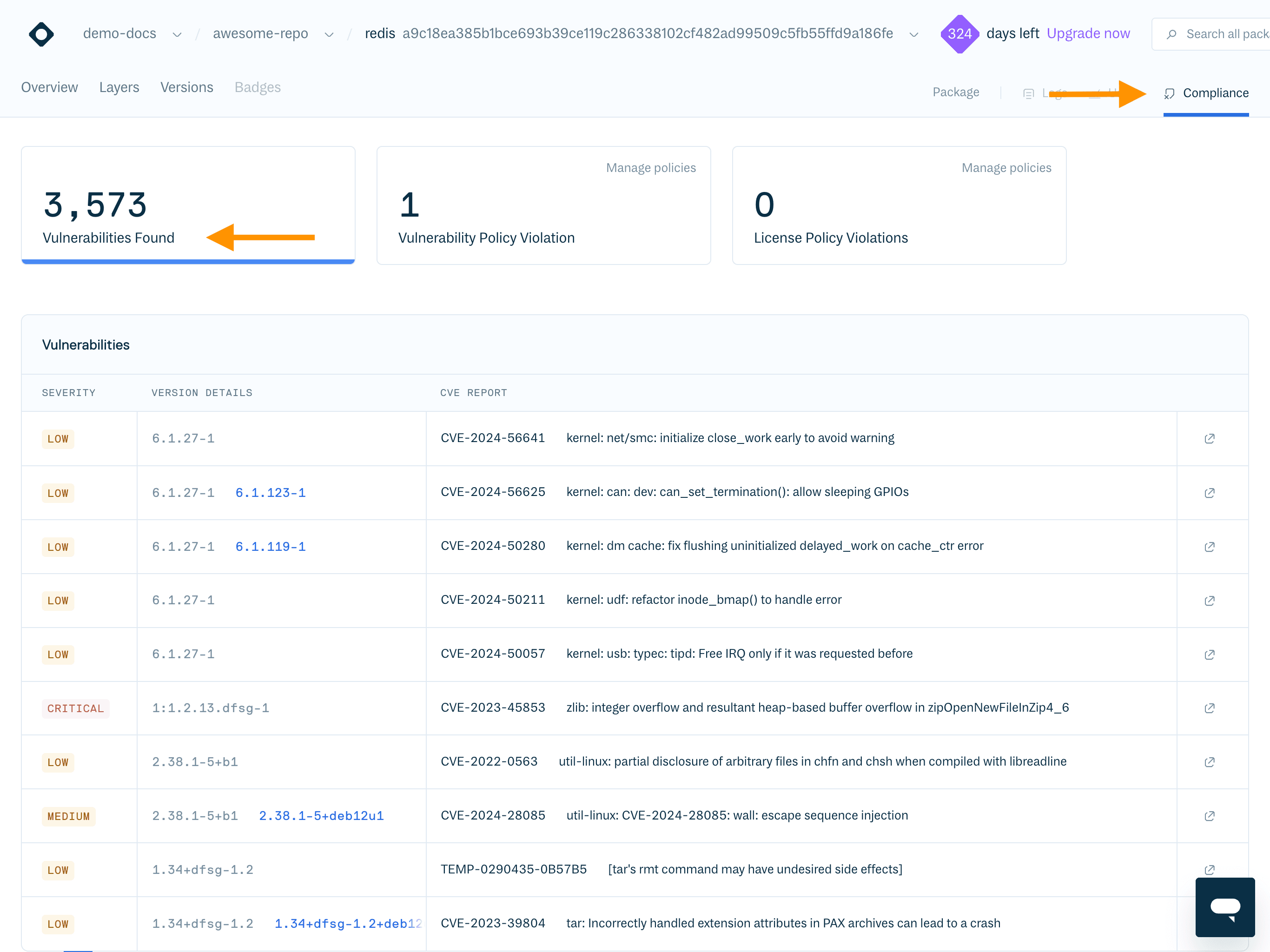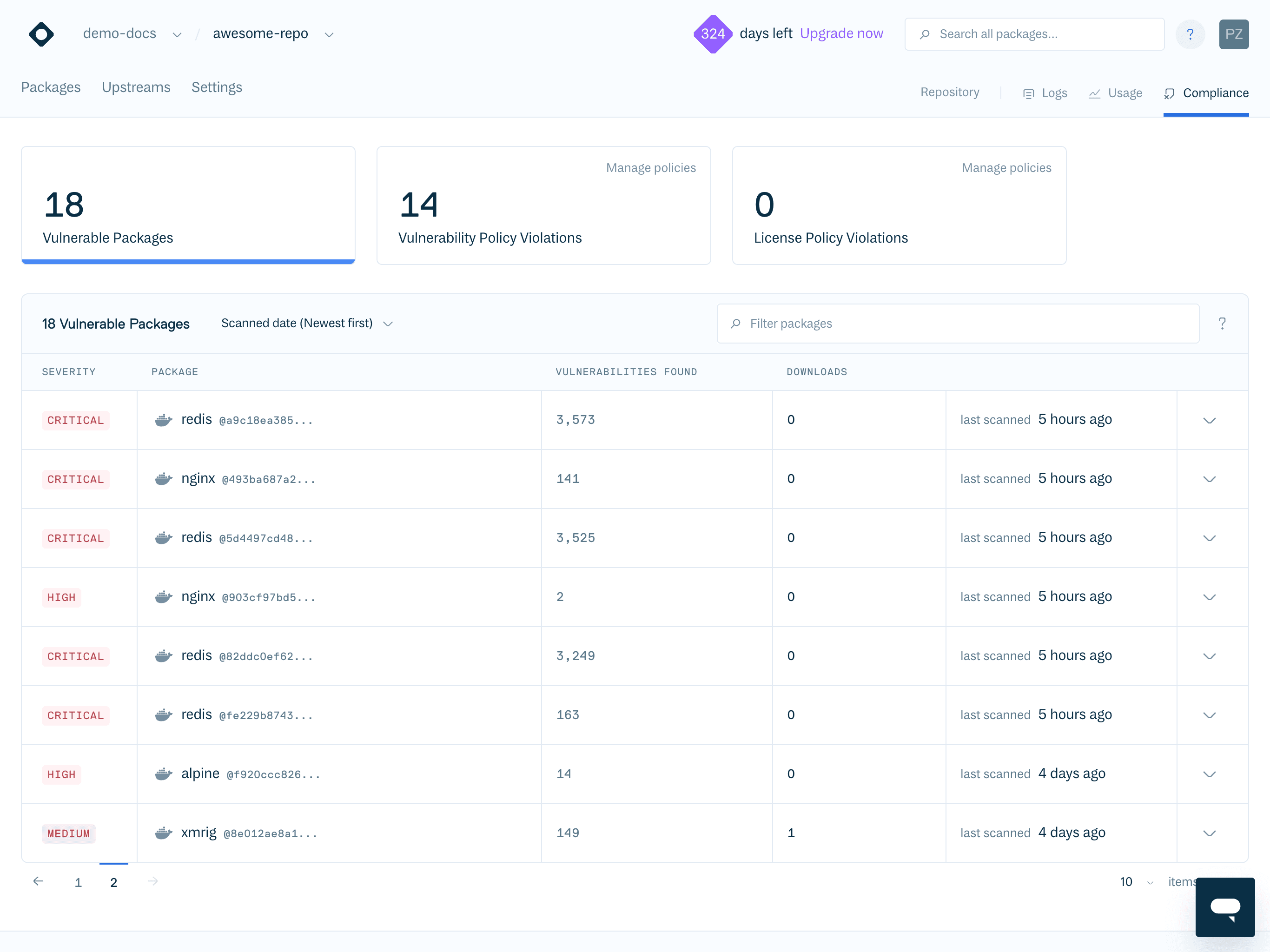 You can find an overview of all the packages that have been scanned, or are awaiting an additional scan, via the "Compliance / Security" page in any repository: