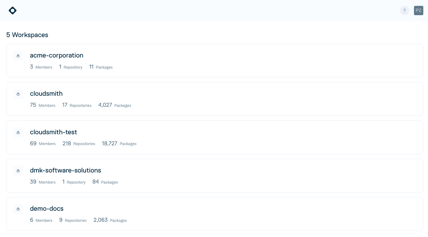 Click in the Cloudsmith Logo in the top left corner to see all the Workspaces that you can access with your account. Alternatively browse to: https://app.cloudsmith.com/workspaces.