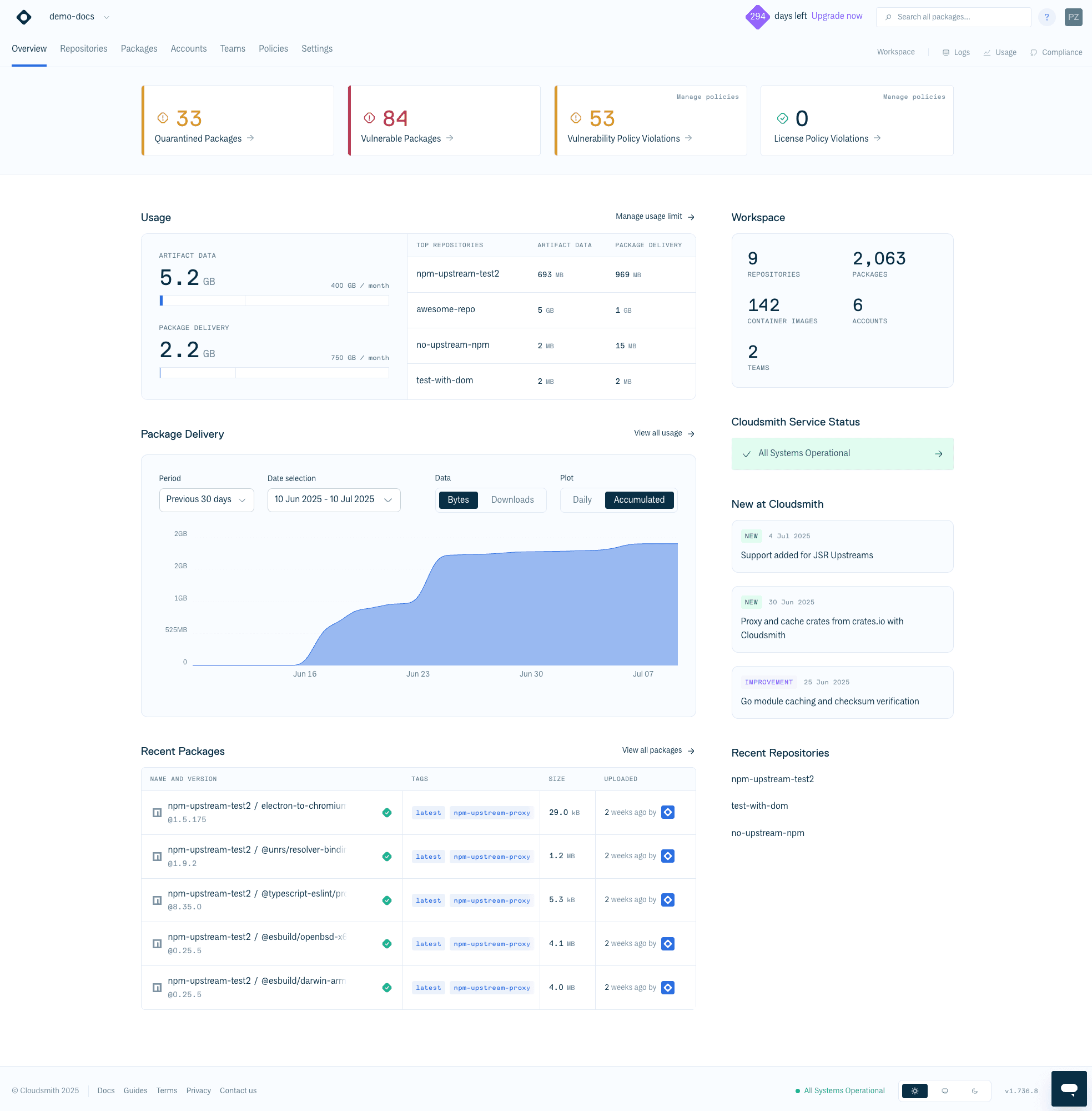 The workspace overview page provides a summary of your package usage and delivery, with all the information and controls required to understand and manage all your repositories activity. It is organized into several key sections: